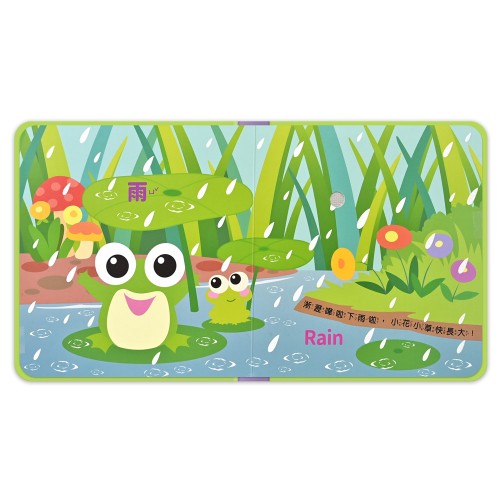 本書採小手點讀及首頁3D立體設計,每一跨頁都設定了不同聲音及情境,透過6組中英認知+6種觸摸+12段生動音效,只要指尖輕輕一按,就能讓孩子探索觸感、辨別聲音、連結視覺,在玩樂中認識大自然,交織出一場身歷其境的感官體驗。