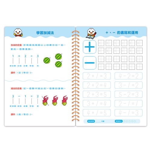 大字形附注音的數學內容,幫孩子打下基礎認知,同時配合凹槽畫圖、寫字,家長也可以依照孩子的程度幫忙評分,促進親子間互動關係,共享親子互動時光。書末還有連連看等小遊戲,讓孩子學會以後練習,強化認知記憶。