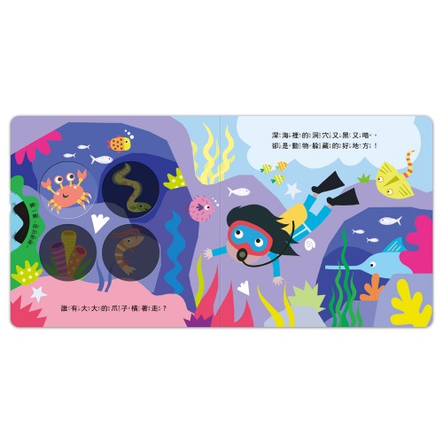 海洋世界裡有好多美麗、可愛又不可思議的生物,一起轉動神奇的魔法轉盤,潛入海底世界,找出躲藏起來的小動物們,學習有趣知識!