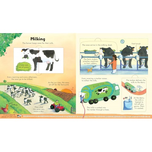 這本書充滿了驚喜,能讓好奇心旺盛的孩子們樂在其中,它包含層層翻頁、旋轉輪盤和迷你折疊小冊子。你可以探索乳牛的一天,了解農場如何隨著季節更迭而變化,以及農場裡各種各樣的動物和機械。這本創意十足的翻頁書將帶領孩子們走進農場生活。