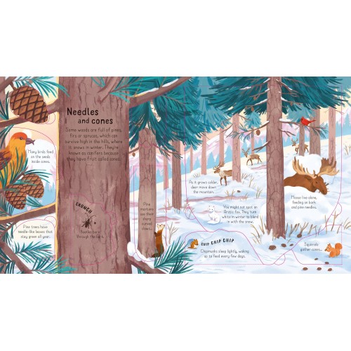本書帶喜愛大自然的小讀者穿越樹林,找一找樹葉下,灌木叢後面隱藏著什麼,探索鳥類、松鼠、狐狸和熊各種動物的習性,並理解樹木與樹林,以及幫助地球更宜人居的方法。