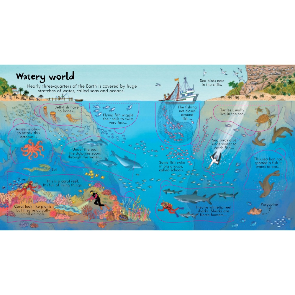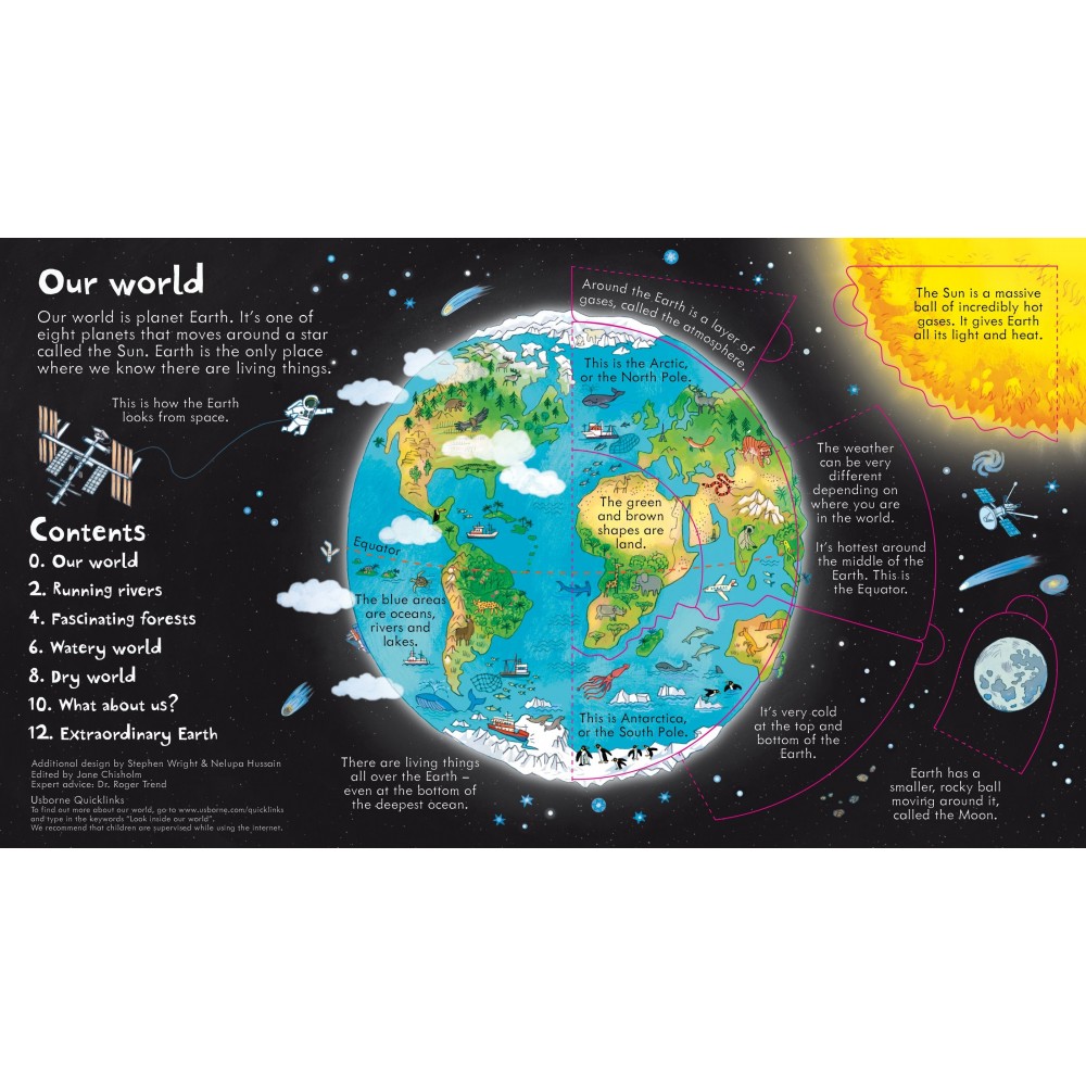 從整顆地球的構成說起─地殼、地函和地核─;接著來到我們賴以維生的河流、巨大濃密的雨林景觀、廣闊的海洋,造就了「藍色地球」的美稱。當然也來到了乾燥的沙漠、寒冷的南極;最後告訴你人類如何生活以及帶你一窺這個獨特的地球景觀。