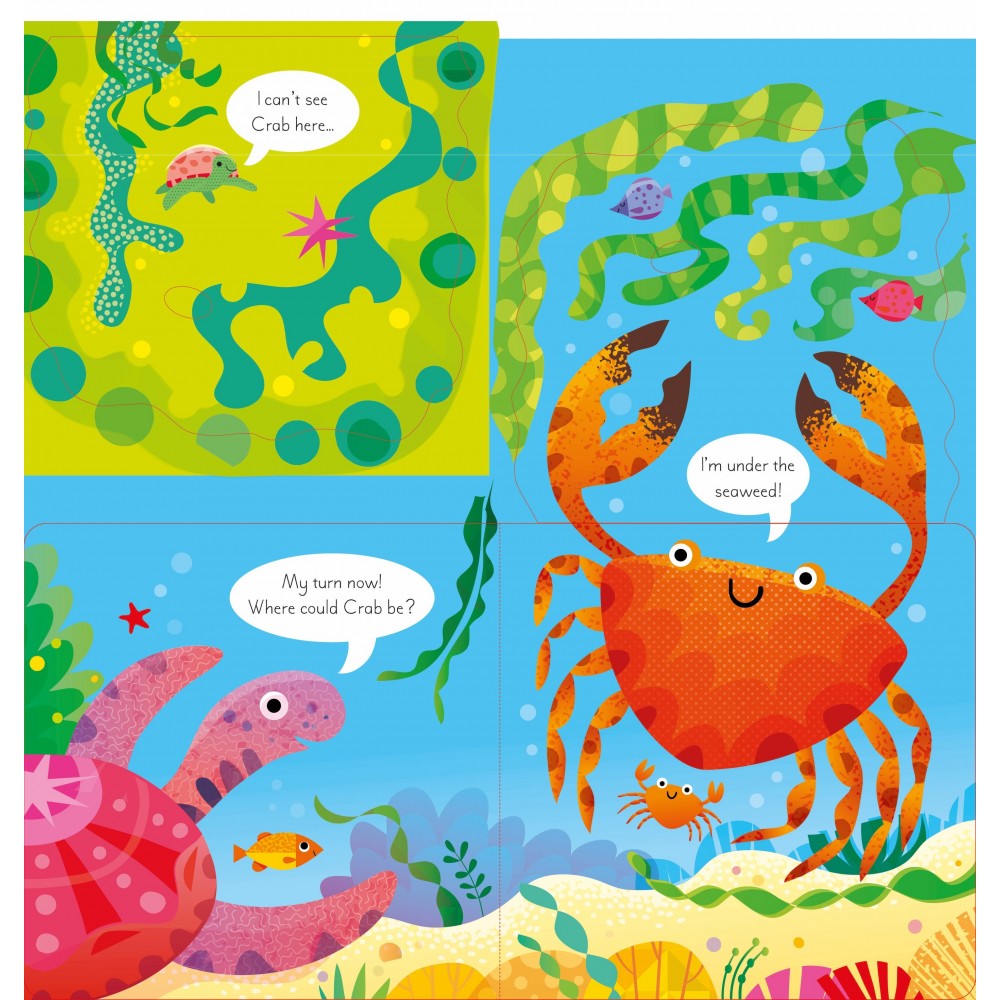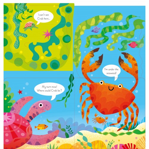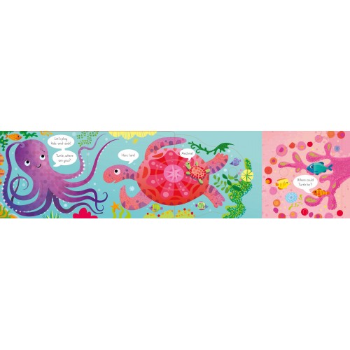 章魚在玩捉迷藏…你想加入嗎?小朋友一定會喜歡這本插圖精美的書,翻開大大的摺頁,看看每個摺頁後面藏著什麼。除了章魚,海底世界還有海龜、螃蟹、魚和海馬等著你去發現。