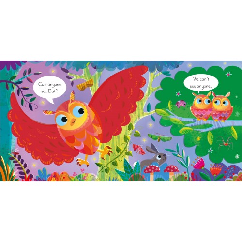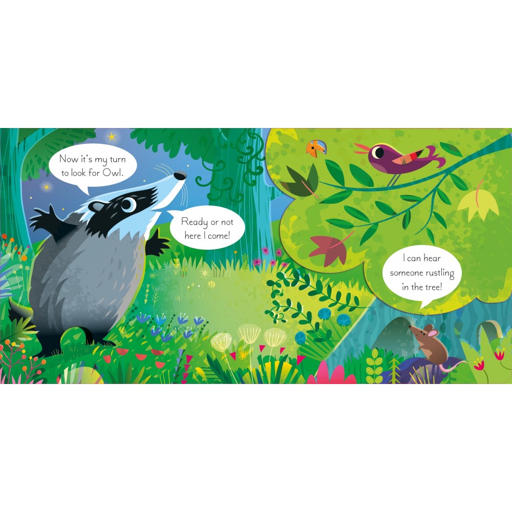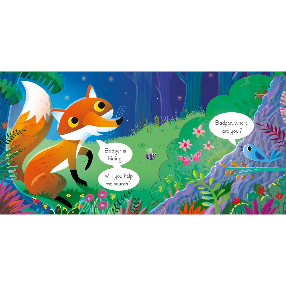 小朋友一定會喜歡翻開這本書每一頁的大翻頁,尋找藏在底下的森林動物。書中精美的插圖充滿了有趣的細節,孩子們可以仔細觀察並討論。翻頁上還設有小孔,方便孩子們一窺狐狸、獾、貓頭鷹、老鼠或其他這次藏起來的小動物。