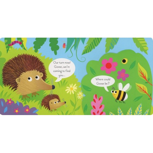 來和青蛙朋友一起玩捉迷藏吧!小朋友一定會喜歡翻開大大的翻頁,尋找藏在後面的可愛小動物,包括刺蝟、鴨子、鵝和老鼠。本書由加雷斯·盧卡斯繪製了明亮生動的插圖,文字簡潔易懂,是一本值得反覆閱讀的精美繪本。